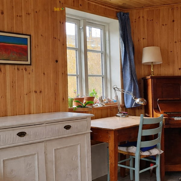 The house has two rooms on the first floor with four sleeping spaces. On the ground floor, there is a bathroom, a kitchen/living area with a dining space and a cozy corner, as well as a room with a double bed and a piano.